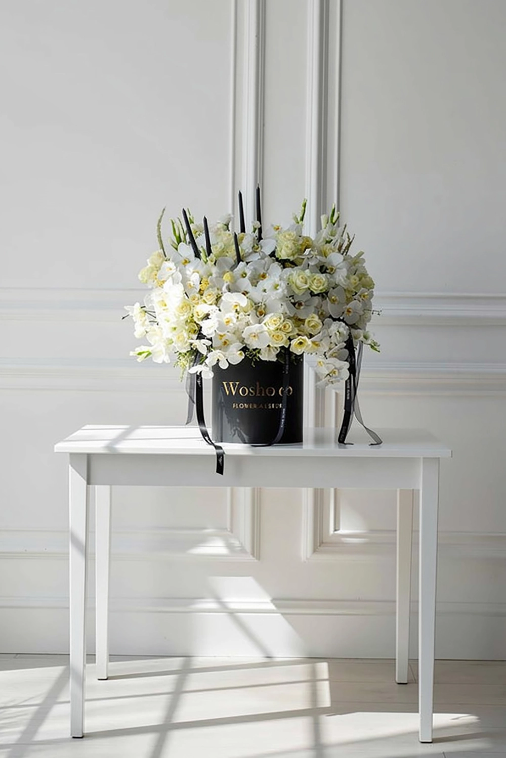 طراحی باشکوه و حجیم این باکس گرد، با ترکیبی فاخر از ارکیده‌های سفید، رزهای ممتاز و گل‌های منتخب فصل، جلوه‌ای موقر و تاثیرگذار در فضای مراسم ترحیم ایجاد می‌کند.