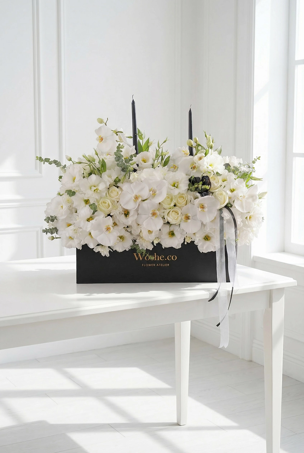 باکس لوکس مشکی با روبان ظریف، جلوه‌ای رسمی و سنگین به این چیدمان بخشیده و بدون نیاز به گلدان، آماده‌ی قرارگیری در محل مراسم است.