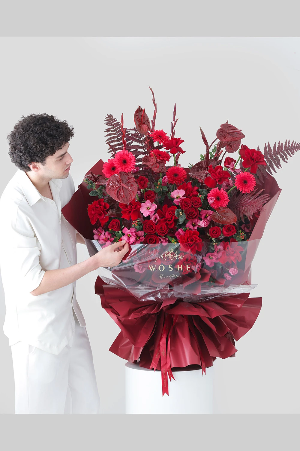 دسته گل امضای وشه، چیدمان هوشمندانه رز های هلندی، ژربرا، لیسینتوس آنتریوم رنگ آمیزی شده به همراه اکسسوری های خاص تزیینی به طوری که جلوه ای سه بعدی ایجاد کرده است (dimensional design)