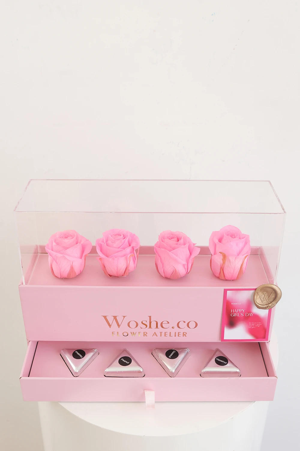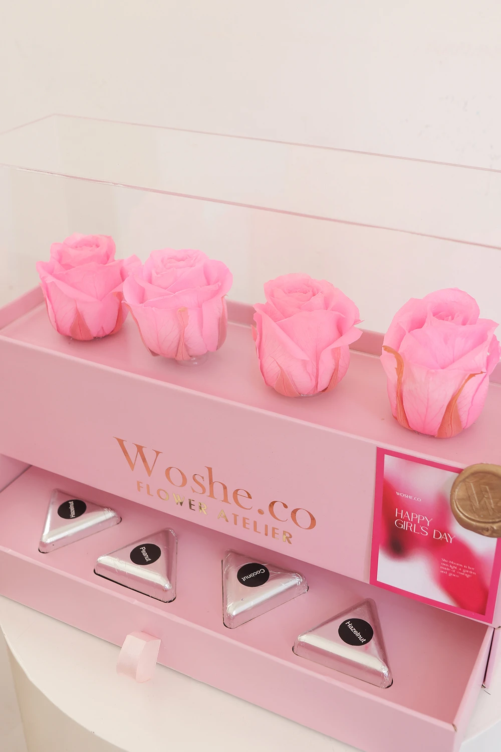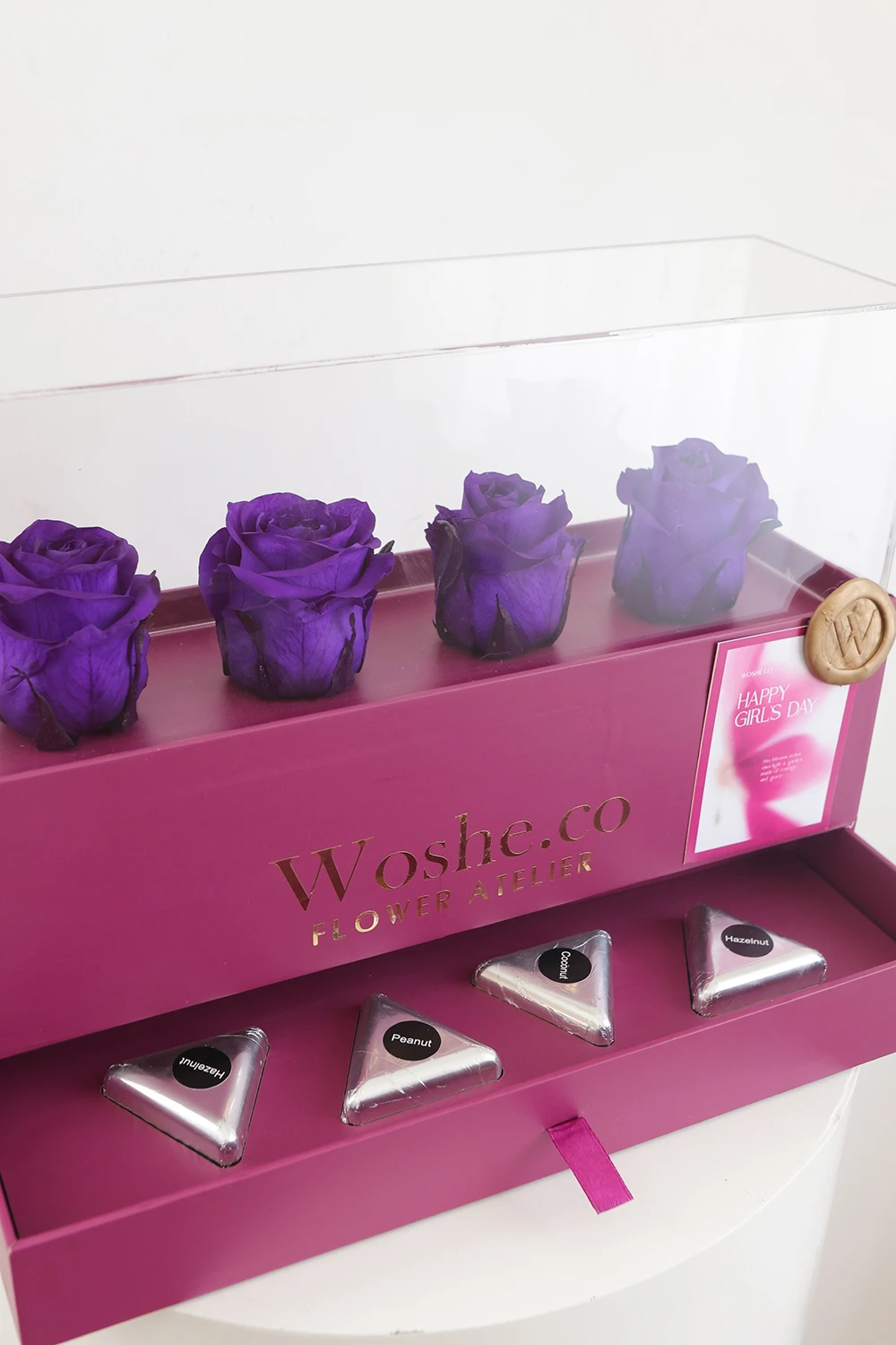 چهار عدد شکلات بار دستساز که با کره کاکائو اصیل بلژیکی و مواد اولیه منتخب از Callebaut Belgium ساخته شدهاند، در کنار چهار رز هلندی طبیعی که طی فرآیندی ویژه ماندگار شده و برای مدت طولانی زیبایی خود را حفظ میکنند—ترکیبی از هنر، طعم و ماندگاری در قالبی لوکس.”