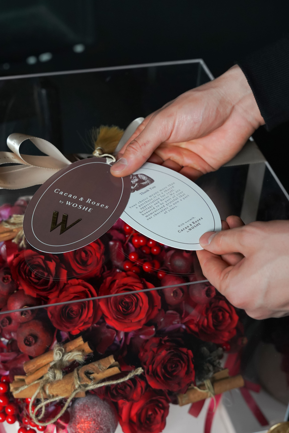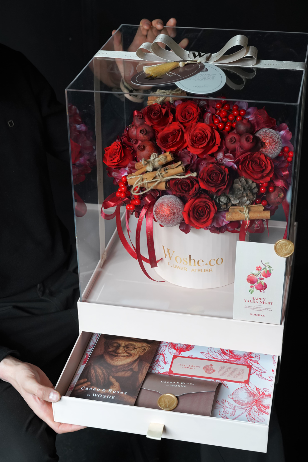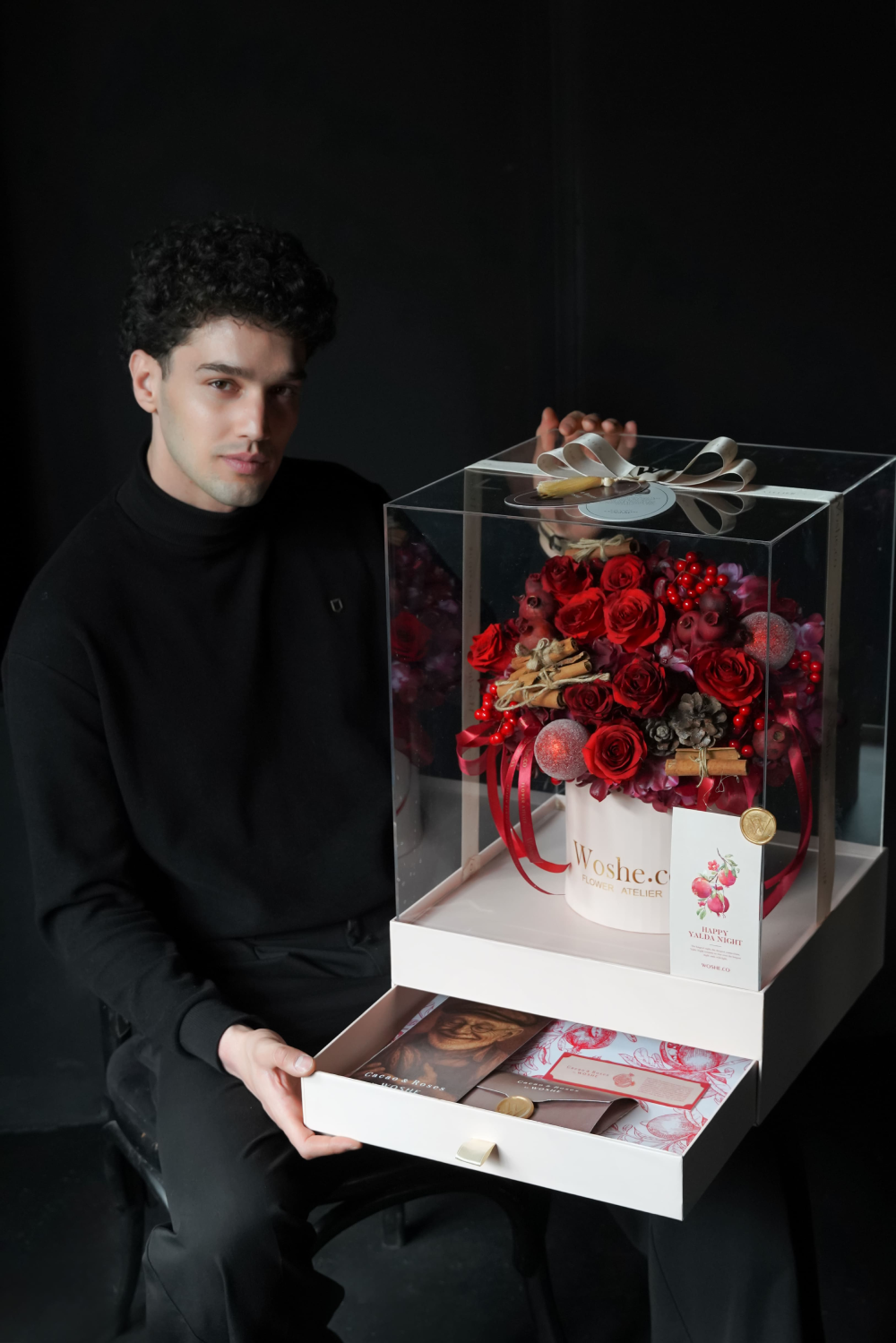 ترکیبی از رزهای جاودان متعدد در کنار شکلاتهای دستساز بلژیکی، در باکسی شفاف و مینیمال که زیبایی را بیواسطه نشان میدهد؛