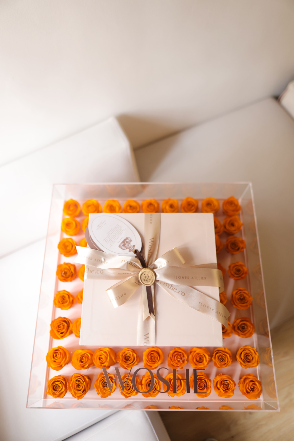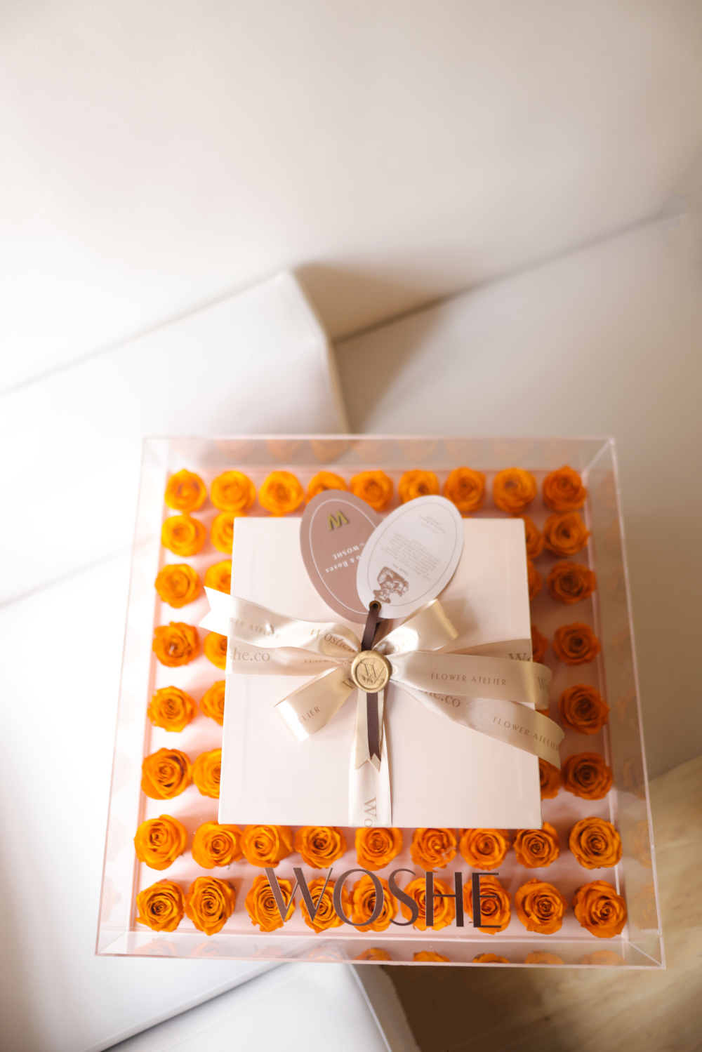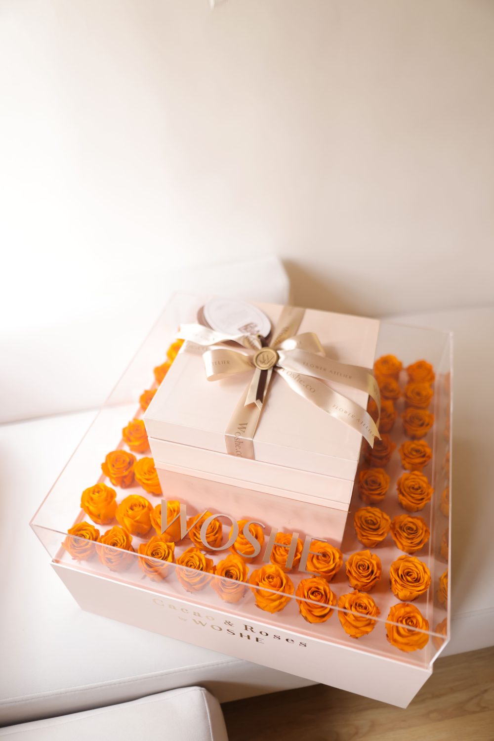 ترکیبی از رزهای جاودان متعدد در کنار شکلاتهای دستساز بلژیکی، در باکسی شفاف و مینیمال که زیبایی را بیواسطه نشان میدهد؛