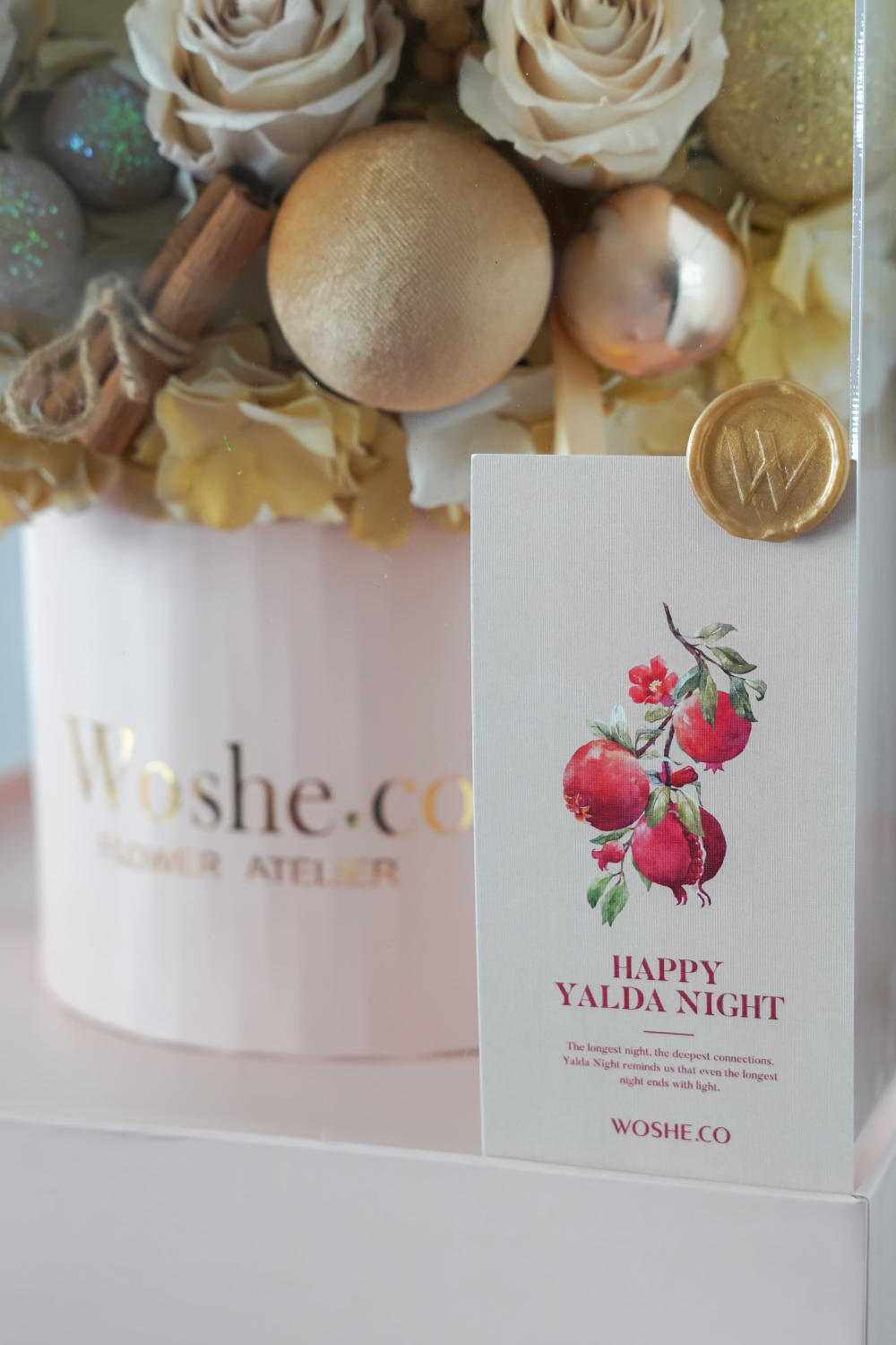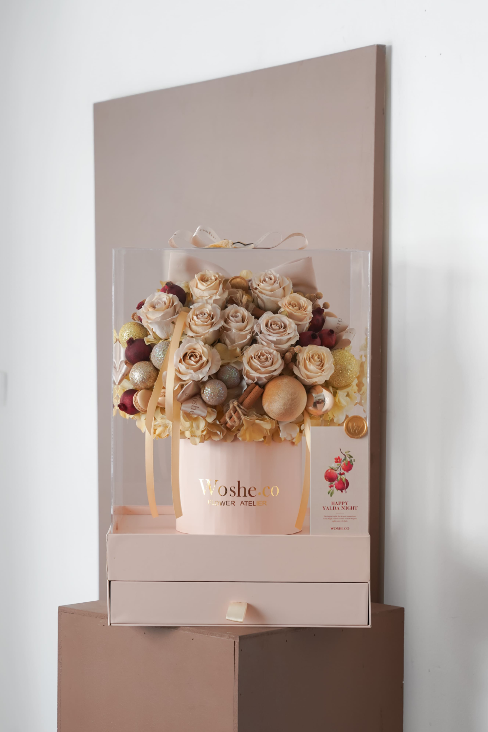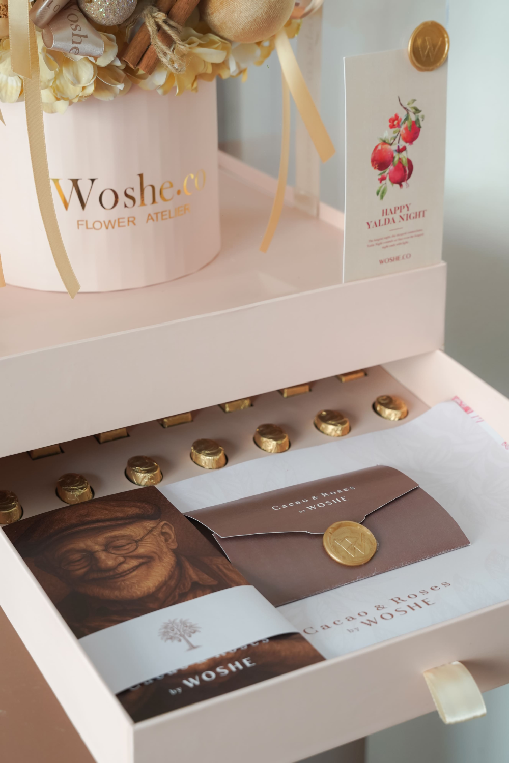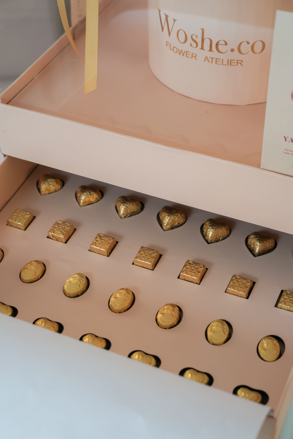 ترکیبی از رزهای جاودان متعدد در کنار شکلاتهای دستساز بلژیکی، در باکسی شفاف و مینیمال که زیبایی را بیواسطه نشان میدهد؛
